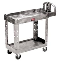 Would you like to buy RUBBERMAID Heavy-Duty Tray-Shelf Carts - Black Ships unassembled to save freight costs-universal uprights make set up quick and easy. RUBBERMAID Heavy-Duty Tray-Shelf Carts handle both industrial and commercial loads. Structural foam construction includes a leakproof top with rounded corners to protect walls, furniture, and equipment. Ergonomically shaped handle includes cord hooks, a drill/mallet rest, and tool slots. The top shelf has two V-notches to hold long tubes in place. Legs are punched with 3/4" dia. holes to thread rods through for storing rolled material or reels. Lightweight and easy to maneuver on 2 fixed and 2 swivel non-marking casters. Optional lockable center ... » More Information about RUBBERMAID Heavy-Duty Tray-Shelf Carts - Black.
